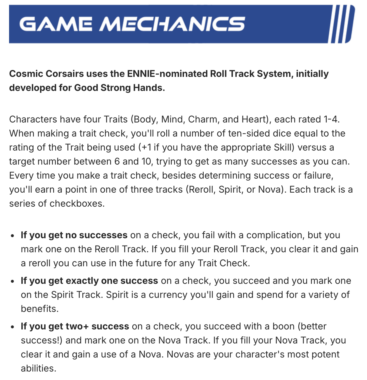 The core game mechanism in Cosmic Corsairs, like Code Warriors before it, is the Tri-Track System Roll Track System. The core game elements in Cosmic Corsairs is depicted using three Tracks: Spirit, Nova, and Reroll. When making a Trait Check, players describe their action and pick an appropriate Trait. They then roll a number of d10 equal to that Trait against a Target Number (difficulty) set by the GameMaster (GM). In order to succeed at least one die must beat the Target Number; any that equal or exceed are considered hits. Those hits are recorded on the Spirit and Nova Tracks whereas non-hits are recorded on the Reroll Track.