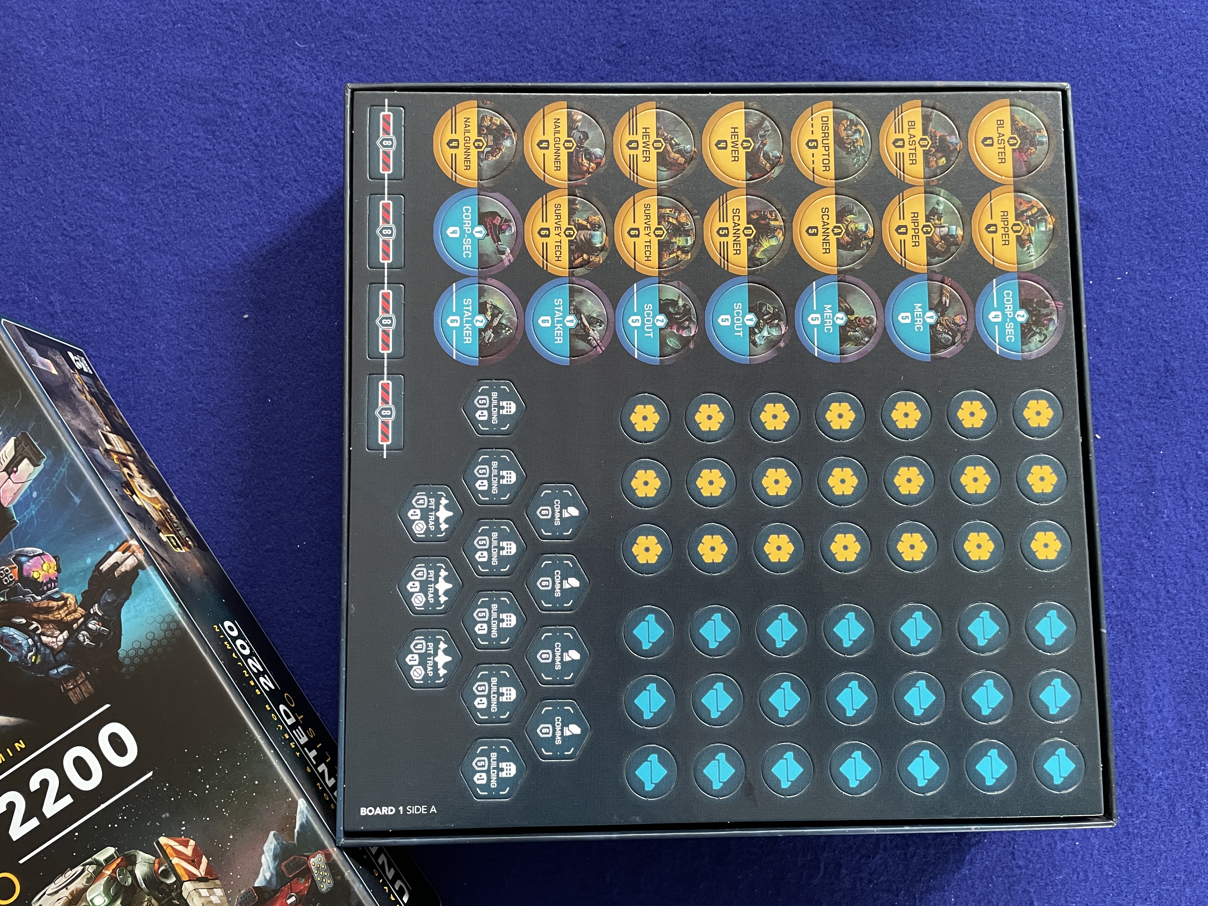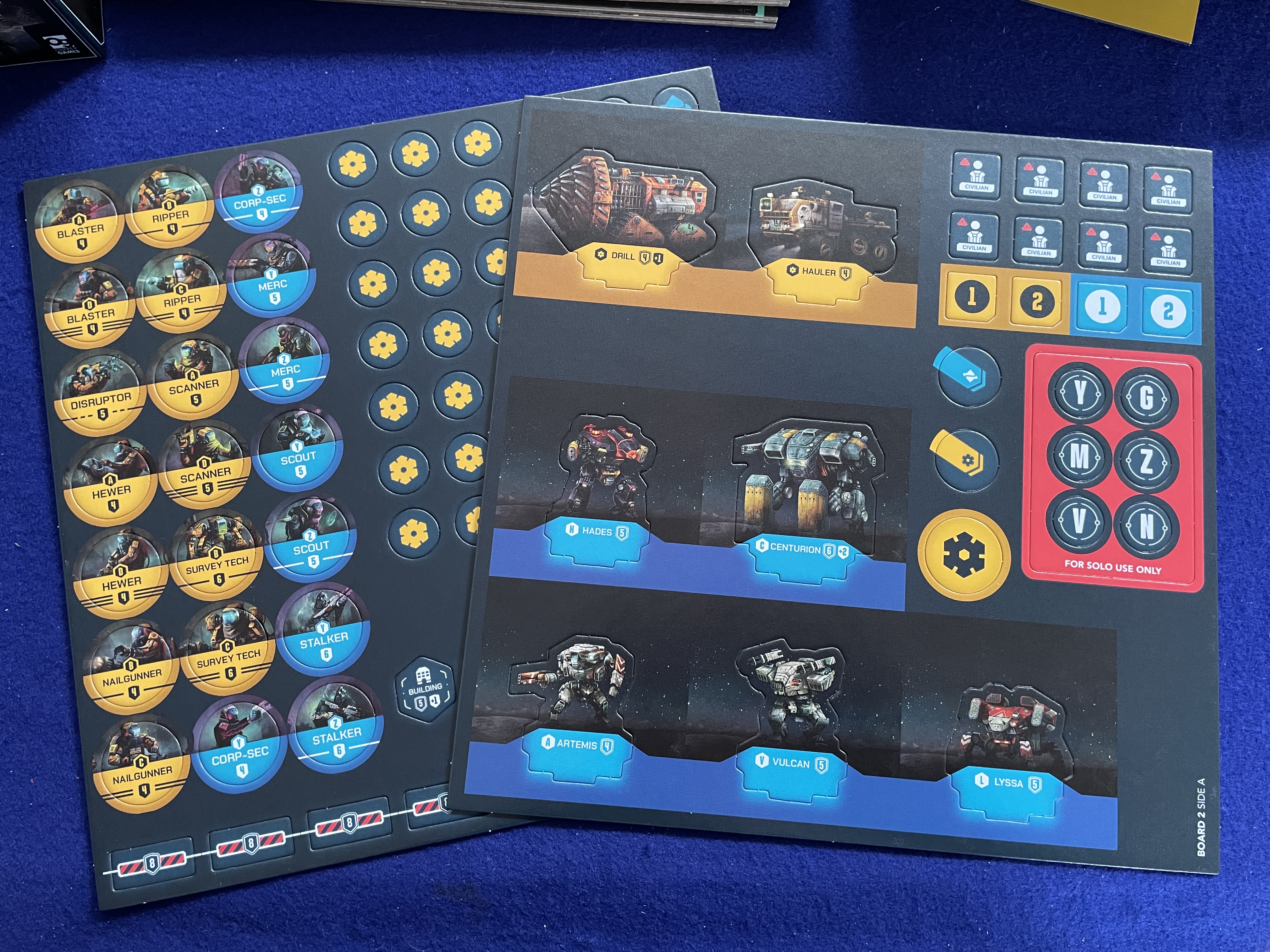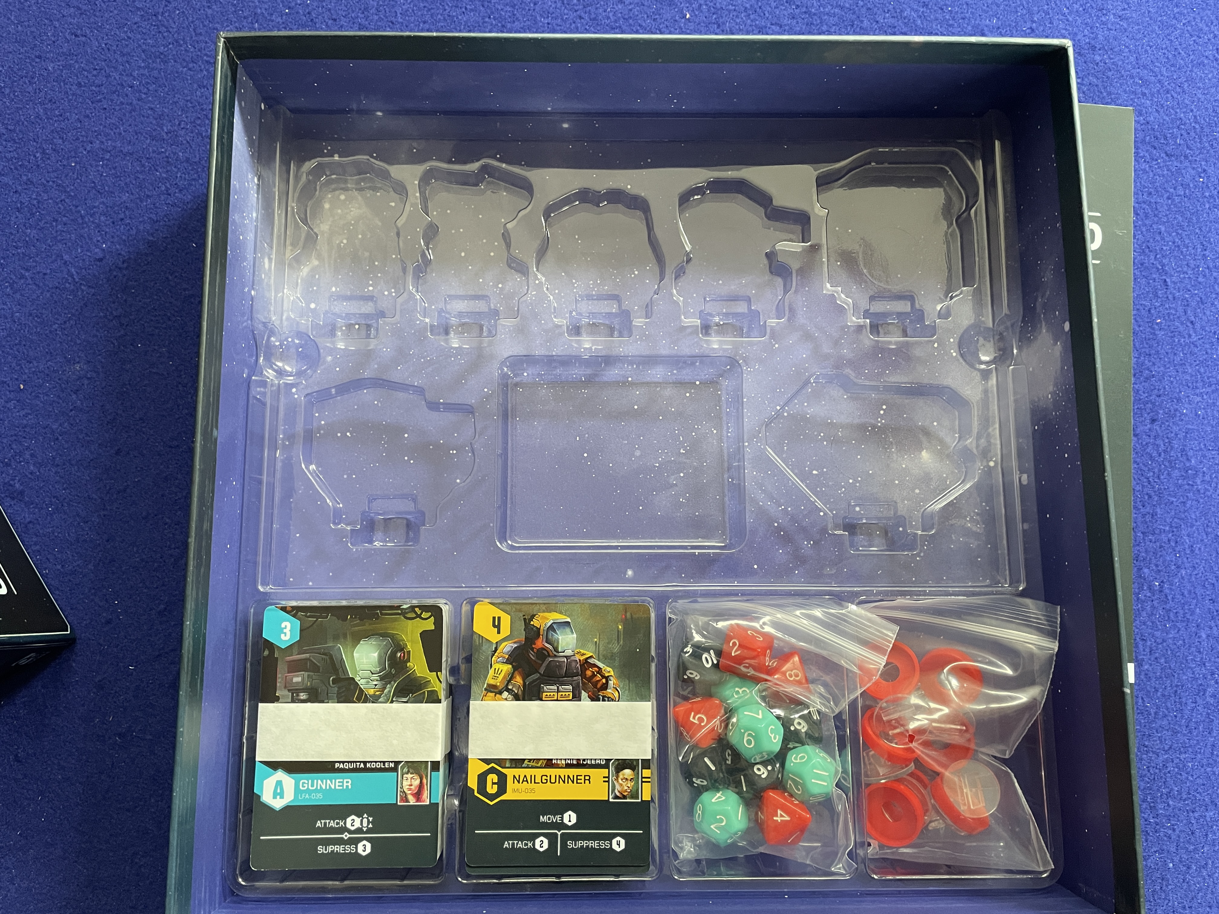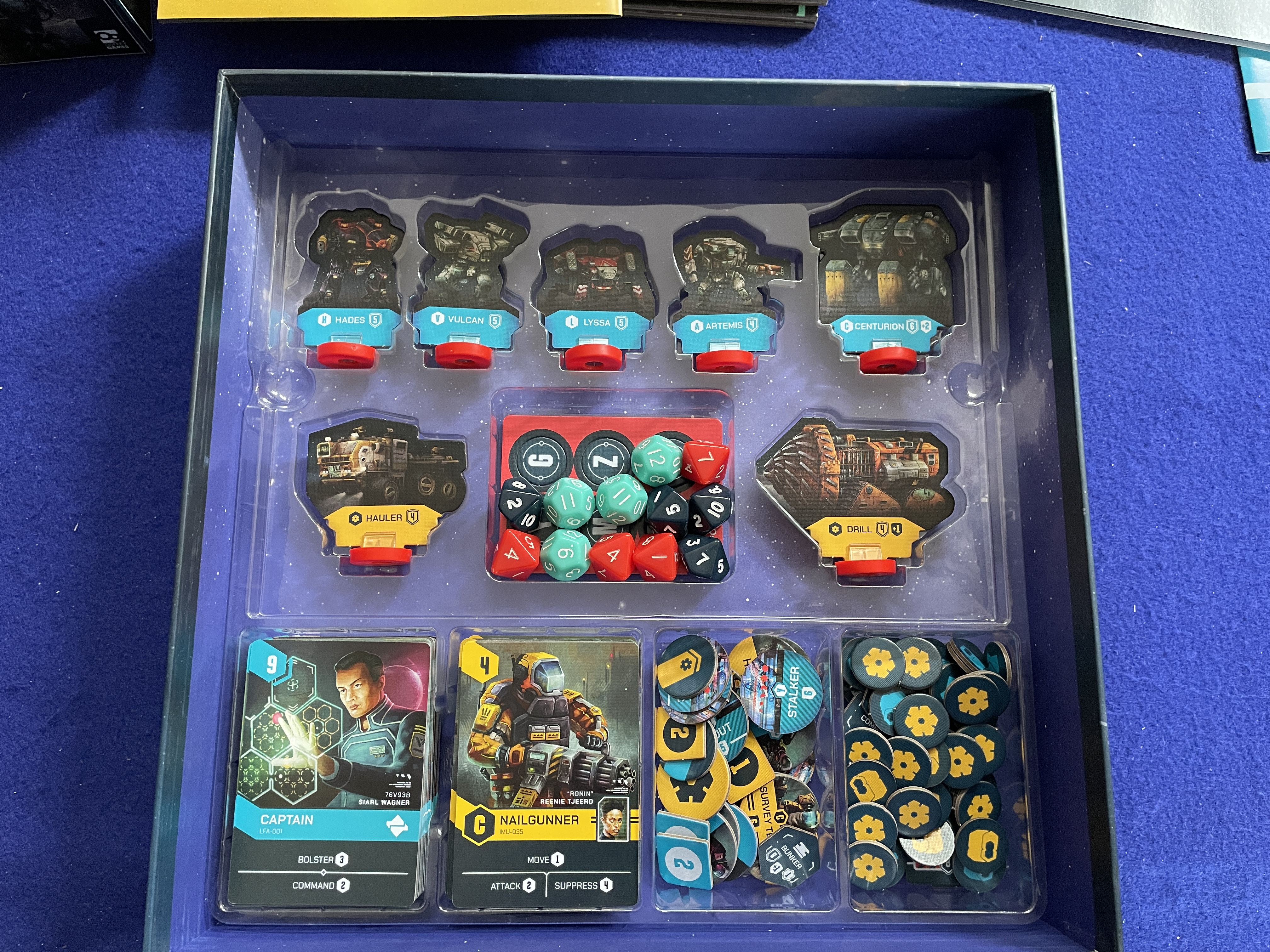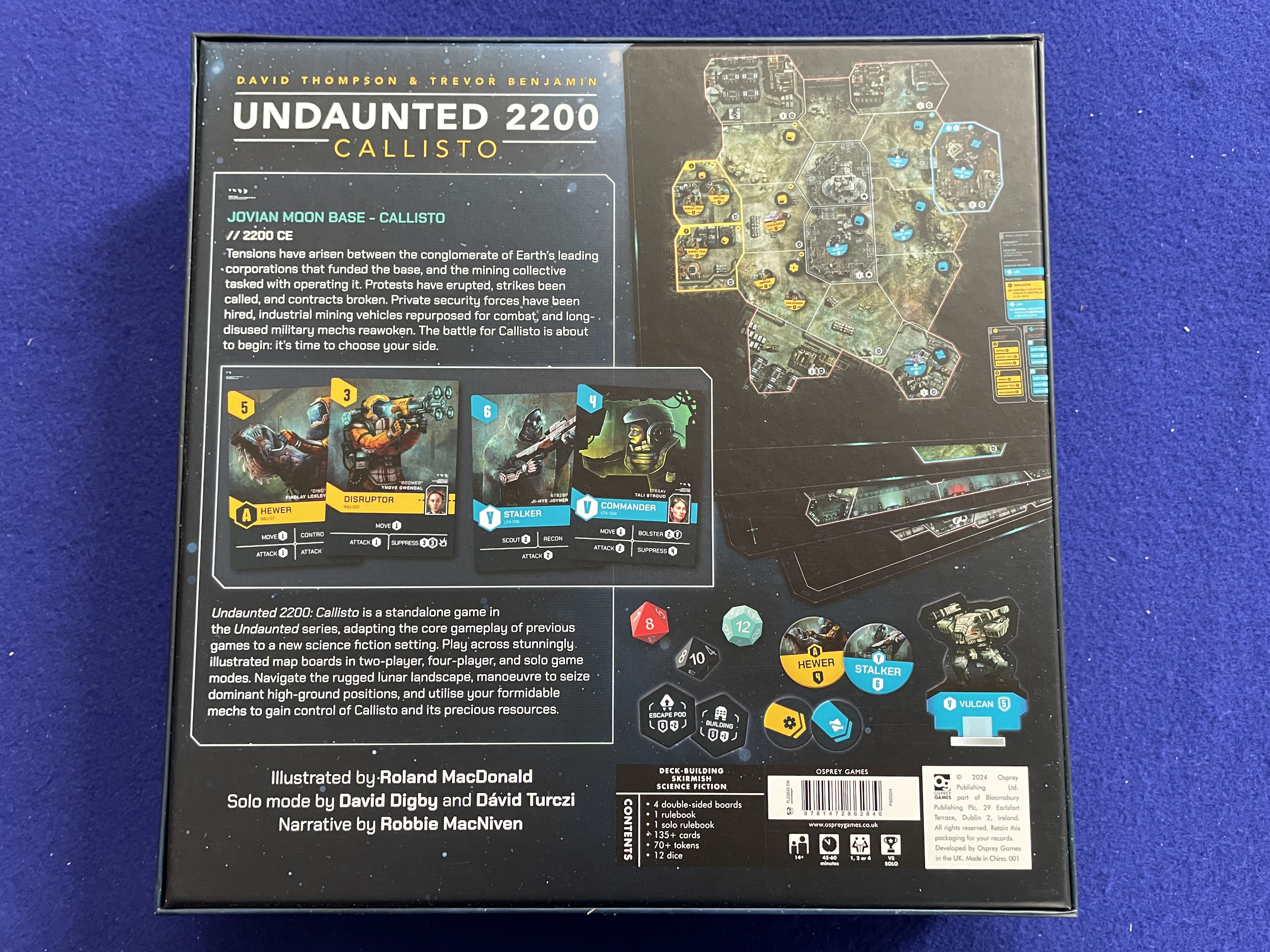 Undaunted 2200: Callisto is a “chunky” game. When they say, “Contents: 4 double-sided boards, Rulebook, Solo Rulebook, 135+ playing cards, 70+ tokens, 12 dice,” it does not tell you that the boards are mounted maps, or that the there are actually three rulebooks (Core rules = 24 pages, Scenario Book = 28 pages, Solo Rulebook = 64(!) pages), nor that the tokens are thick chitboard. It is as if they almost put miniatures into this game! I appreciate the RockyMountainNavy Boys gifting me this game because at $85 retail it is a bit steeply priced…but oh-so-worth it!