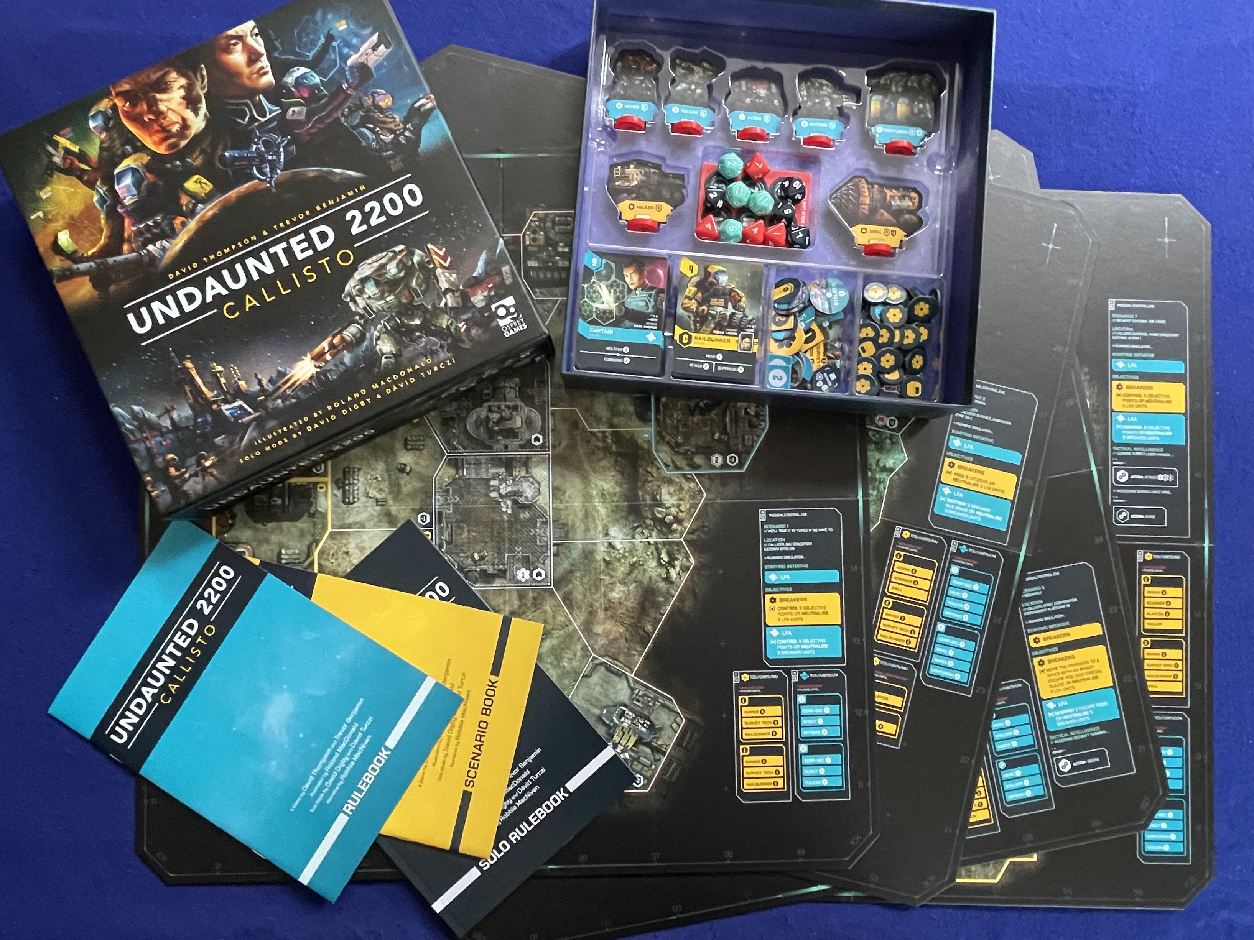 Undaunted 2200: Callisto is a “chunky” game. When they say, “Contents: 4 double-sided boards, Rulebook, Solo Rulebook, 135+ playing cards, 70+ tokens, 12 dice,” it does not tell you that the boards are mounted maps, or that the there are actually three rulebooks (Core rules = 24 pages, Scenario Book = 28 pages, Solo Rulebook = 64(!) pages), nor that the tokens are thick chitboard. It is as if they almost put miniatures into this game! I appreciate the RockyMountainNavy Boys gifting me this game because at $85 retail it is a bit steeply priced…but oh-so-worth it!