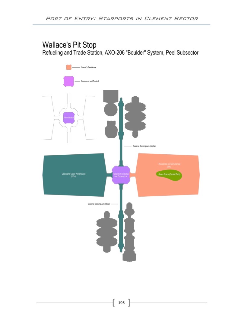 - The grand sample location, Wallace’s Pit Stop (pp. 187-197) is not what I expected; a 25,000 dTon, Class D, privately owned space station. Is this another Buc-ee’s in space?