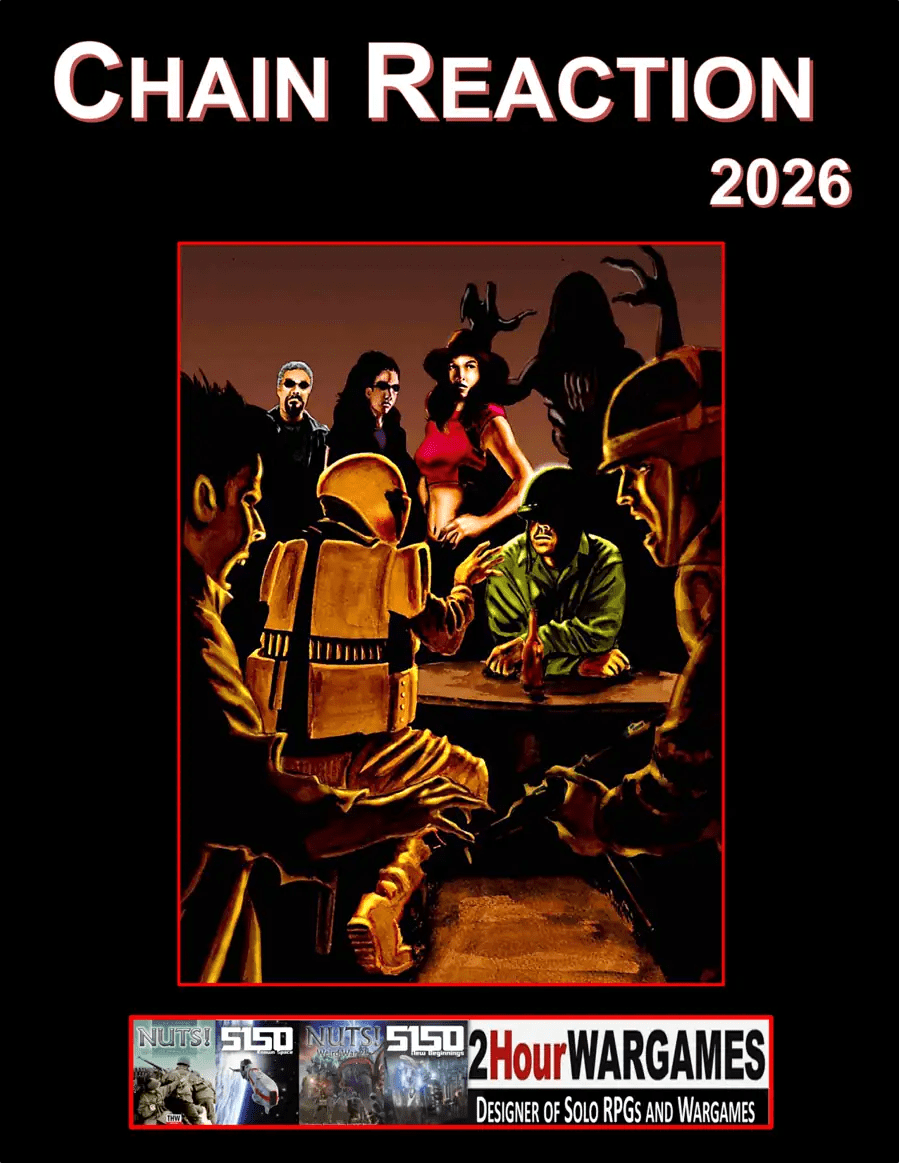 Chain Reaction 2026 is a set of man-to-man combat rules that can be played in a variety of periods and with any figures you may already have. Don’t have figures and terrain? We’re tossing in Counters and a Battle Board to play on. Modern, WW2, Medieval, Sci-fi, and yes, even Fantasy.