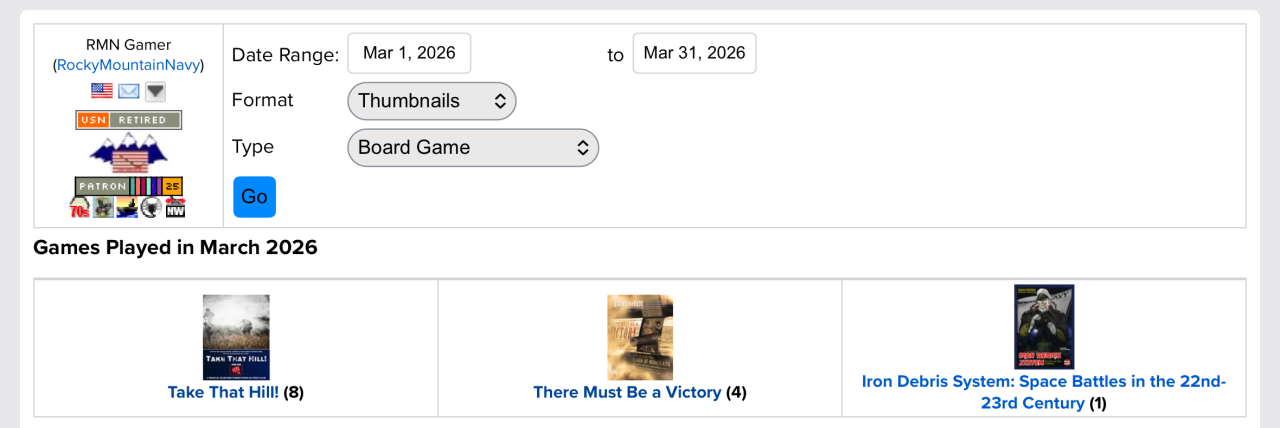 Alas, April and May look to be just as busy—if not busier. Between helping RockyMountainNavy Jr. move into his first house, family visiting for his college graduation, Oldest RMN Boy coming back from overseas duty, and a new work role at the office, I look to have little time to play my games.